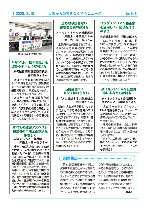 なくす会ニュース No.546 『第54回公害環境デー 世代をこえて地球の未来を語りあう…若者・高校生の発言に希望が見えた!』など